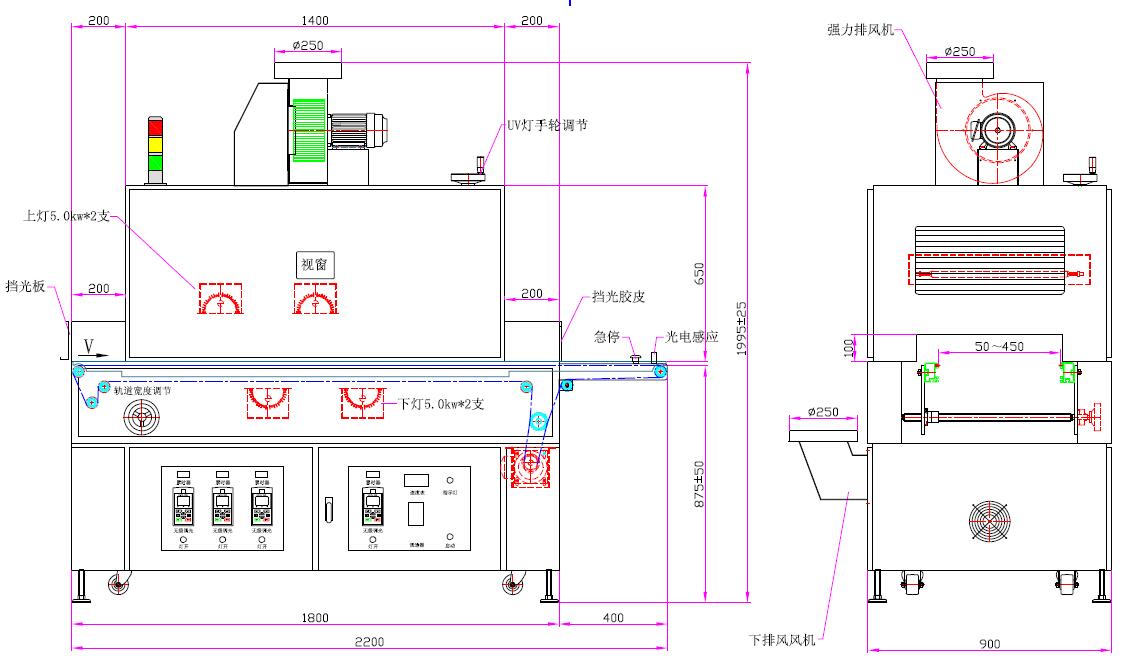1、UV燈功率:5.0kw*4支(UV汞燈) 2、UV燈總長(zhǎng):620mm、弧長(zhǎng):500mm